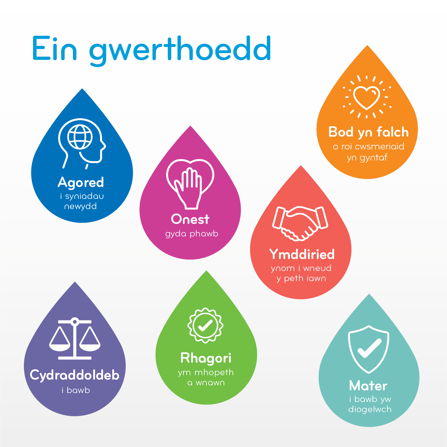 Ein huchelgais yw sicrhau ymddiriedaeth ein cwsmeriaid bob dydd. Mae’n hollbwysig ein bod yn ymddwyn yn gyfrifol fel unigolion ac fel sefydliad bob amser, gan gadw ein gwerthoedd wrth wraidd popeth a wnawn. Drwy gynnal y gwerthoedd hyn, rydym yn sicrhau ein bod yn darparu gwasanaeth o ansawdd uchel yn gyson, yn meithrin amgylchedd gwaith cadarnhaol ac yn cyfrannu at les y cymunedau rydym yn eu gwasanaethu. Maent yn helpu i lywio ein gweithredoedd, yn dylanwadu ar ein penderfyniadau ac yn diffinio ein hymrwymiad i ragoriaeth.