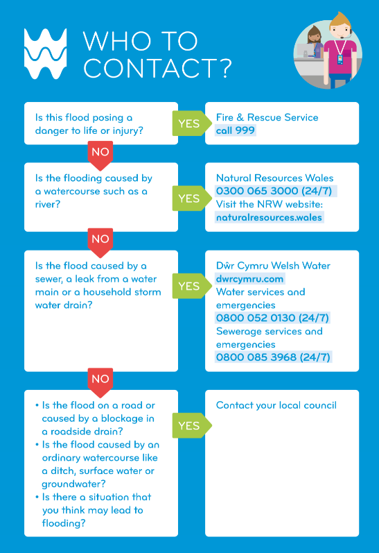 Os mai carthffos gyhoeddus sydd wedi achosi’r llifogydd, ffoniwch ni cyn gynted â phosibl ar 0800 085 3968. Bydd aelod o’n tîm yn ceisio cysylltu â chi o fewn yr awr i roi gwybod i chi pryd y byddwn yn dod. Byddwch hefyd yn cael enw unigolyn cyswllt a fydd yn rheolwr achos i chi yn ystod y digwyddiad.