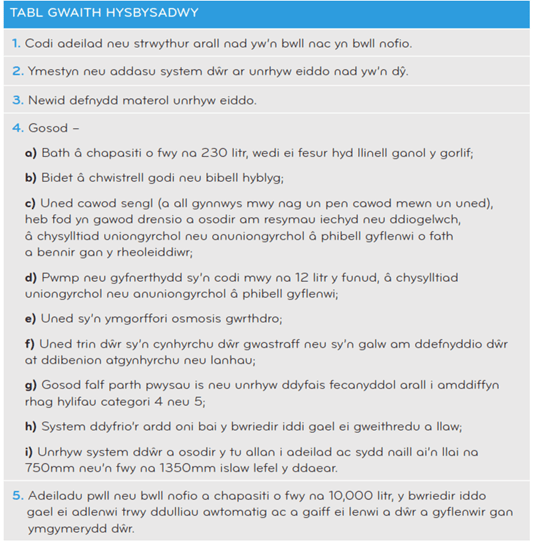Mae Rheoliad 5 o Reoliadau Cyflenwi Dŵr (Ffitiadau Dŵr) 1999 yn gosod cyfrifoldeb ar unrhyw berson sy'n gosod ffitiadau dŵr i'n hysbysu ni os yw'r gwaith yn bodloni rhai meini prawf penodol.